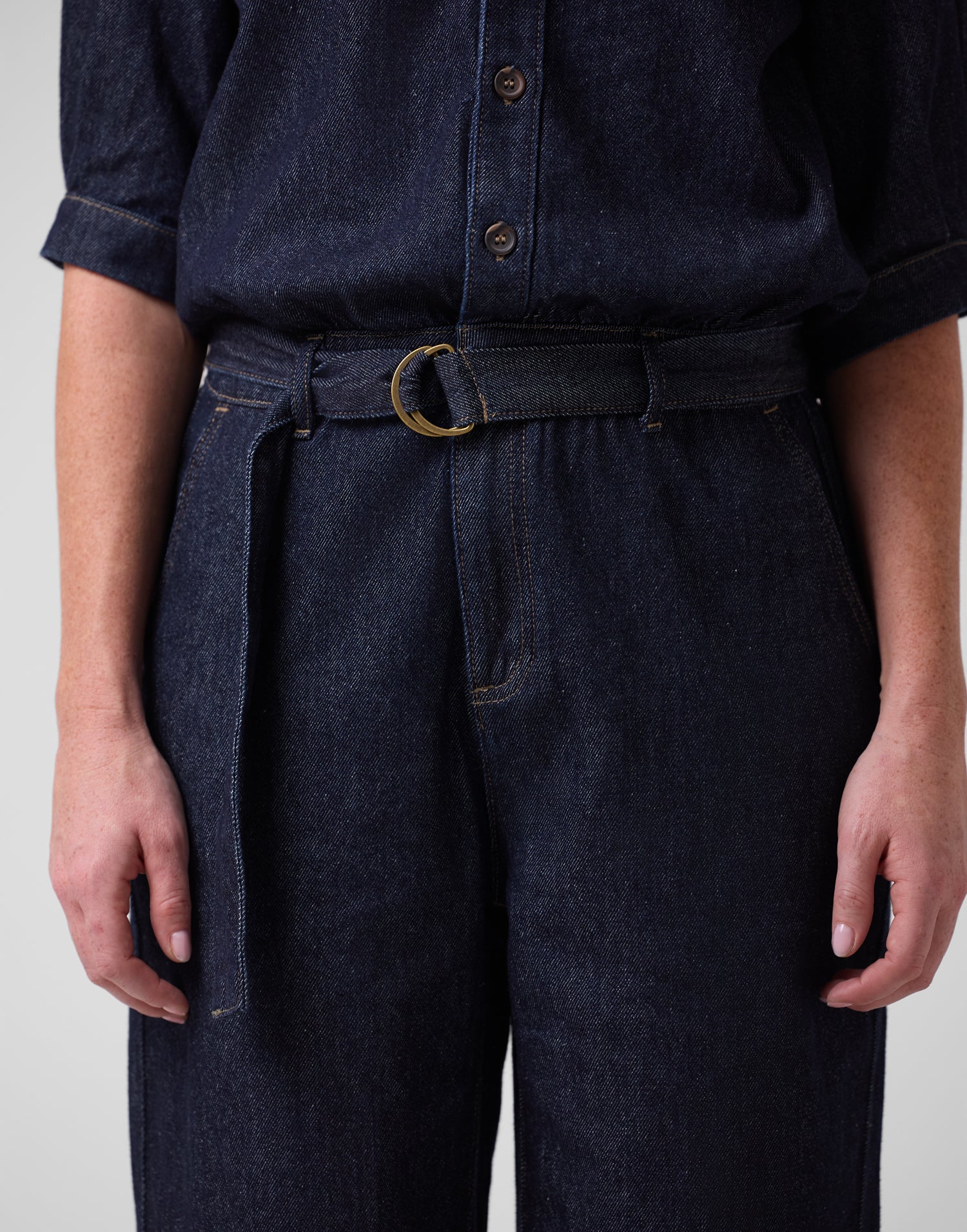 Crafted from dark wash denim, this jumpsuit offers a flattering fit with a coordinating belt to cinch the waist for added definition. It's the classic collar and button-down front exude effortless style, making it perfect for casual outings and formal occasions alike. To maintain the deep indigo color, we use a minimal wash process that conserves water, energy, and resources. A simple, eco-friendly wash that’s far from basic. This jumpsuit has no stretch but offers a soft, lightweight, and loose fit.