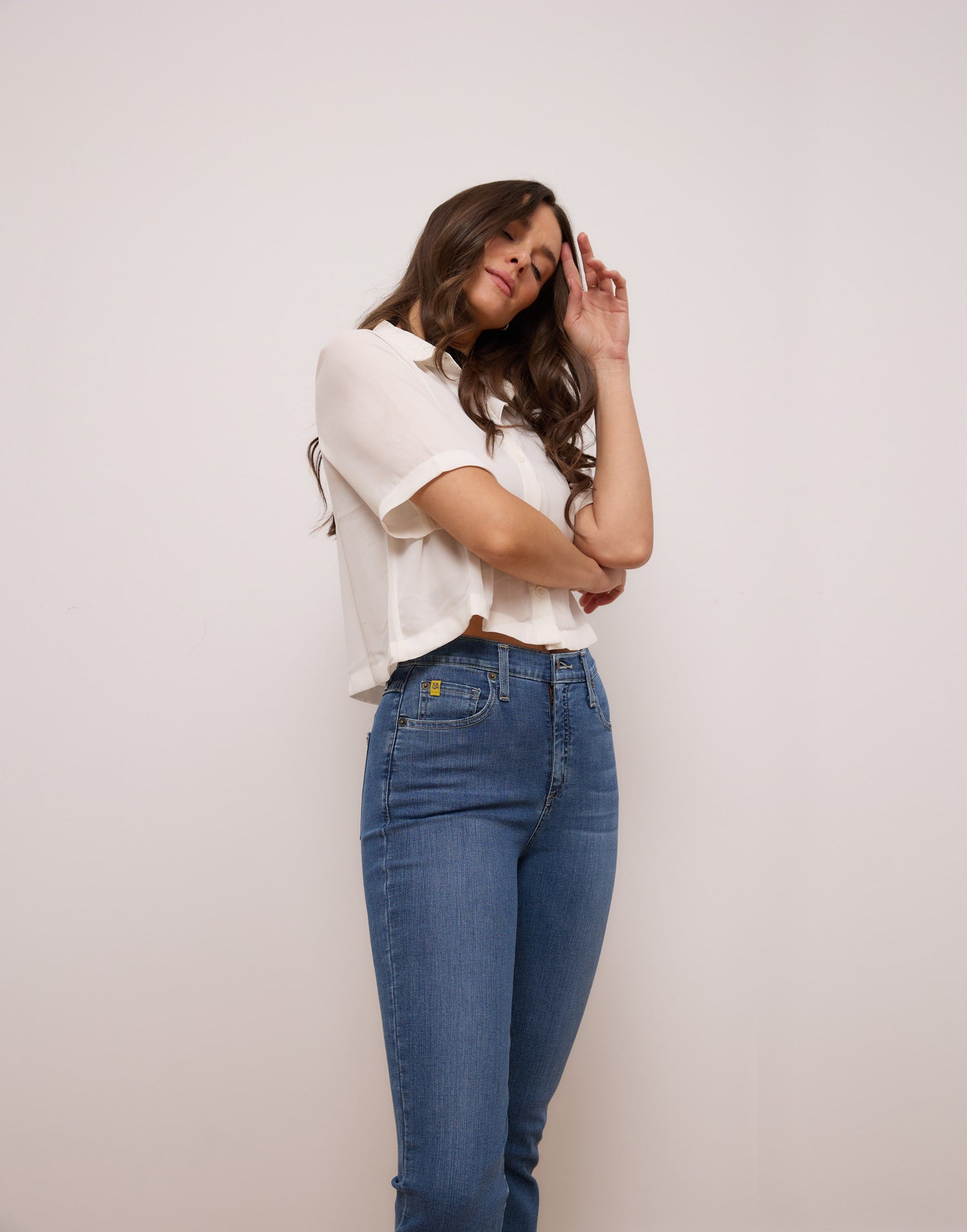 The Emily. Our slim silhouette inspired by 'mom jeans' has a slim fit around the hips and tapered cut throughout the leg.