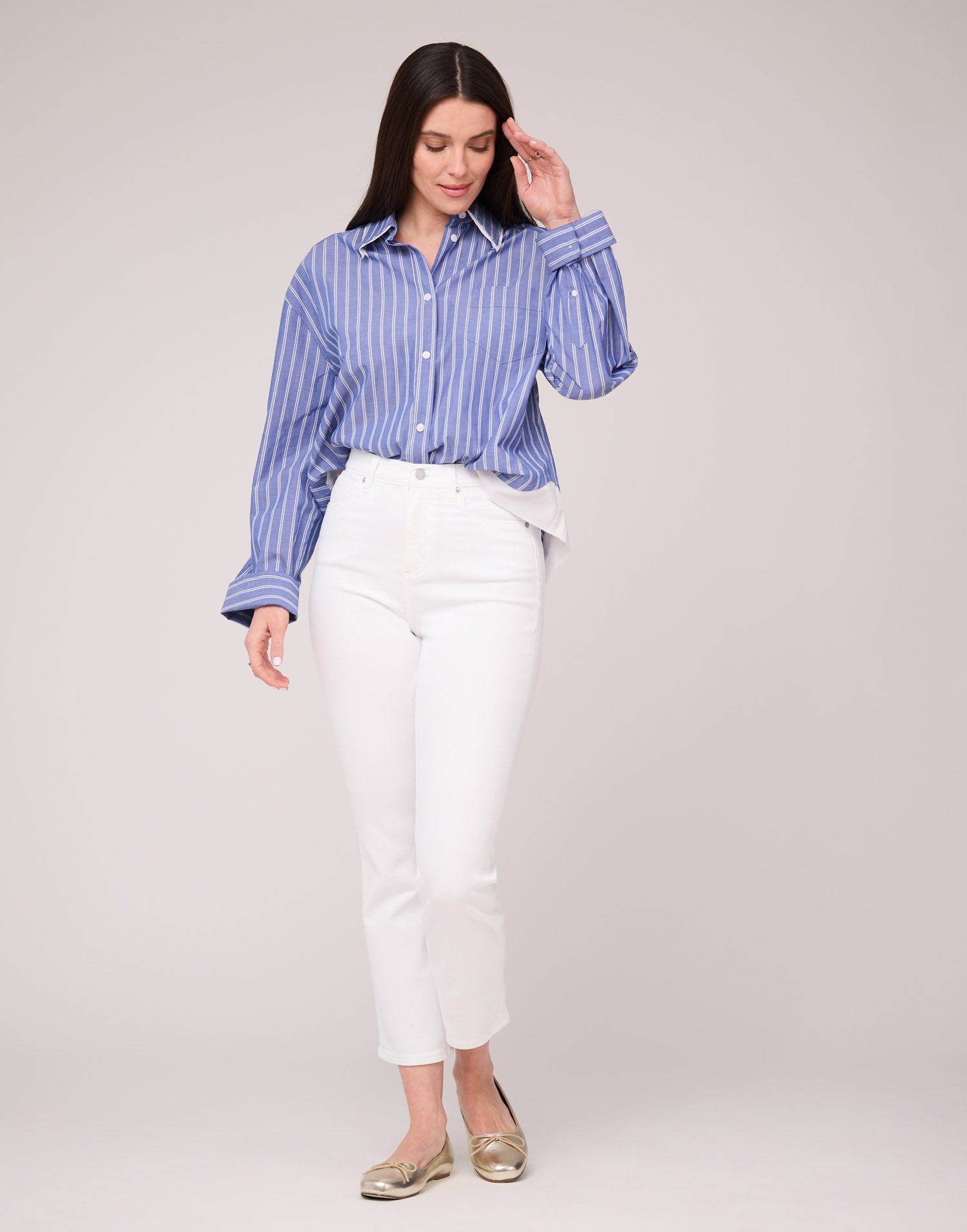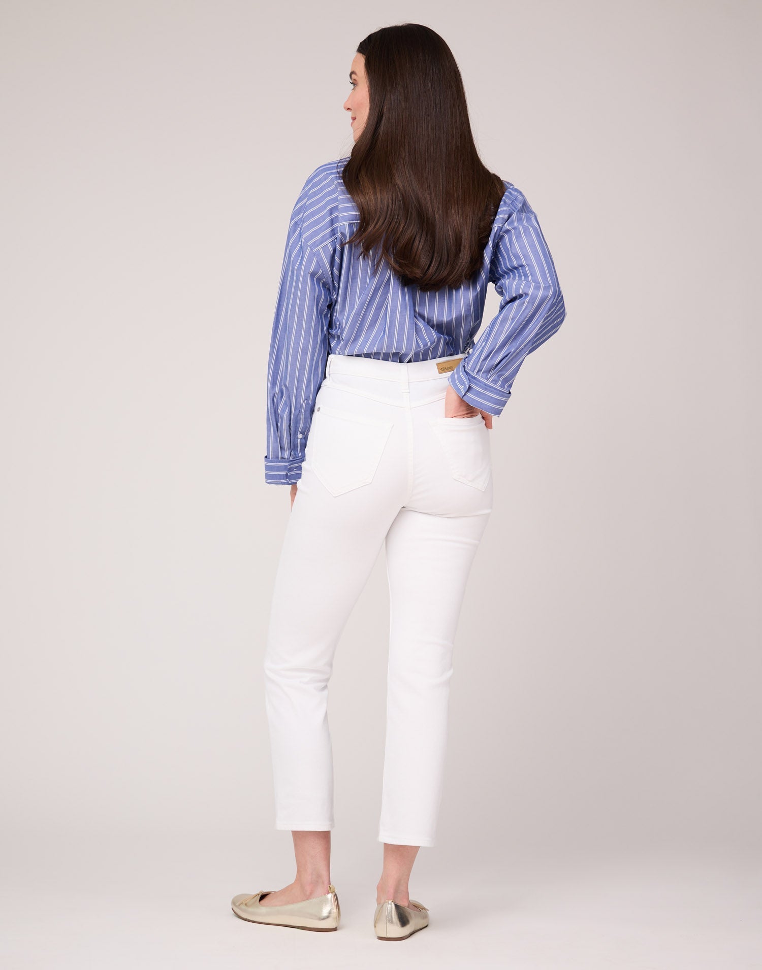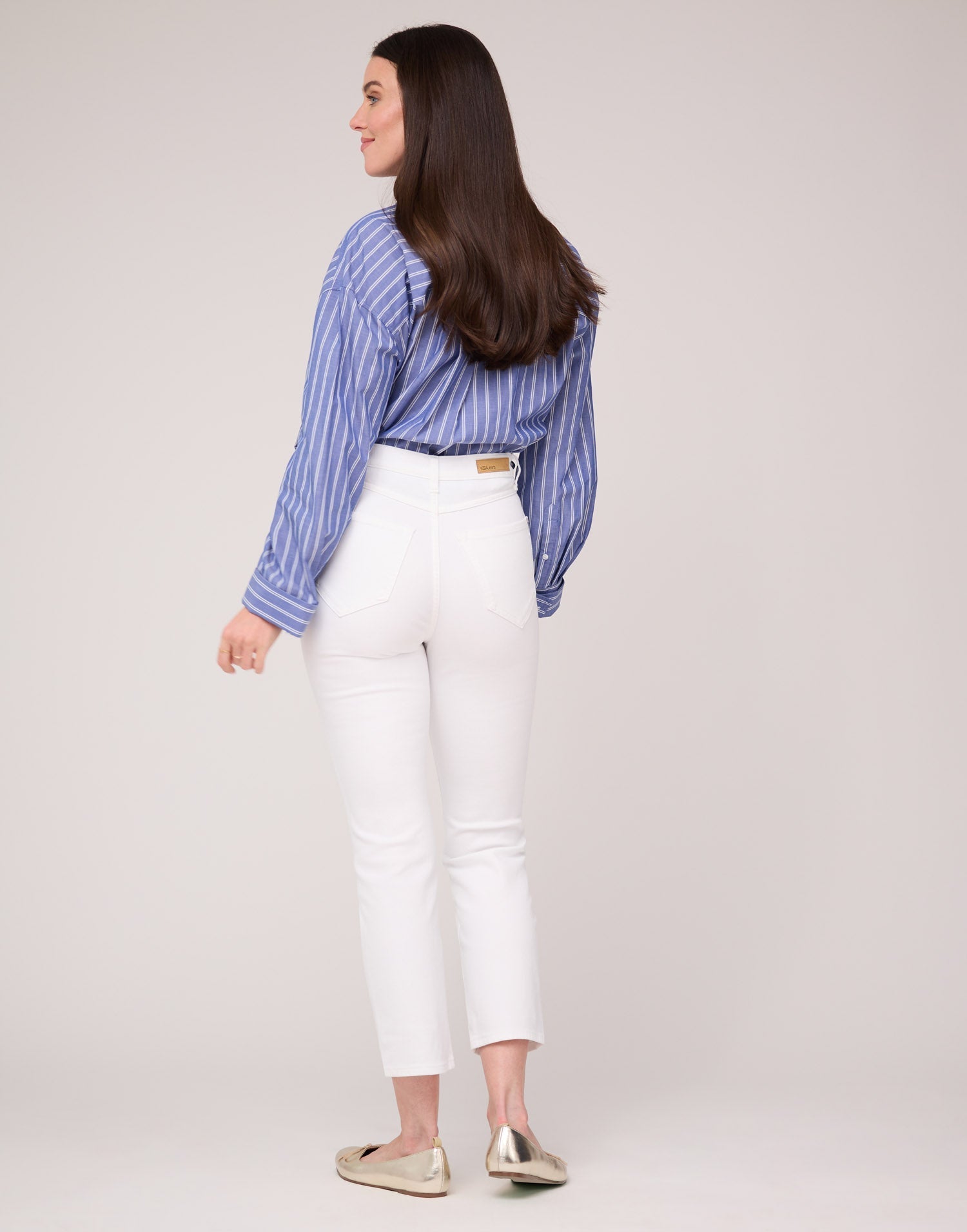 Elevate your wardrobe with our high-rise, 27" inseam trousers, featuring a crisp white hue that exudes contemporary style and timeless sophistication.