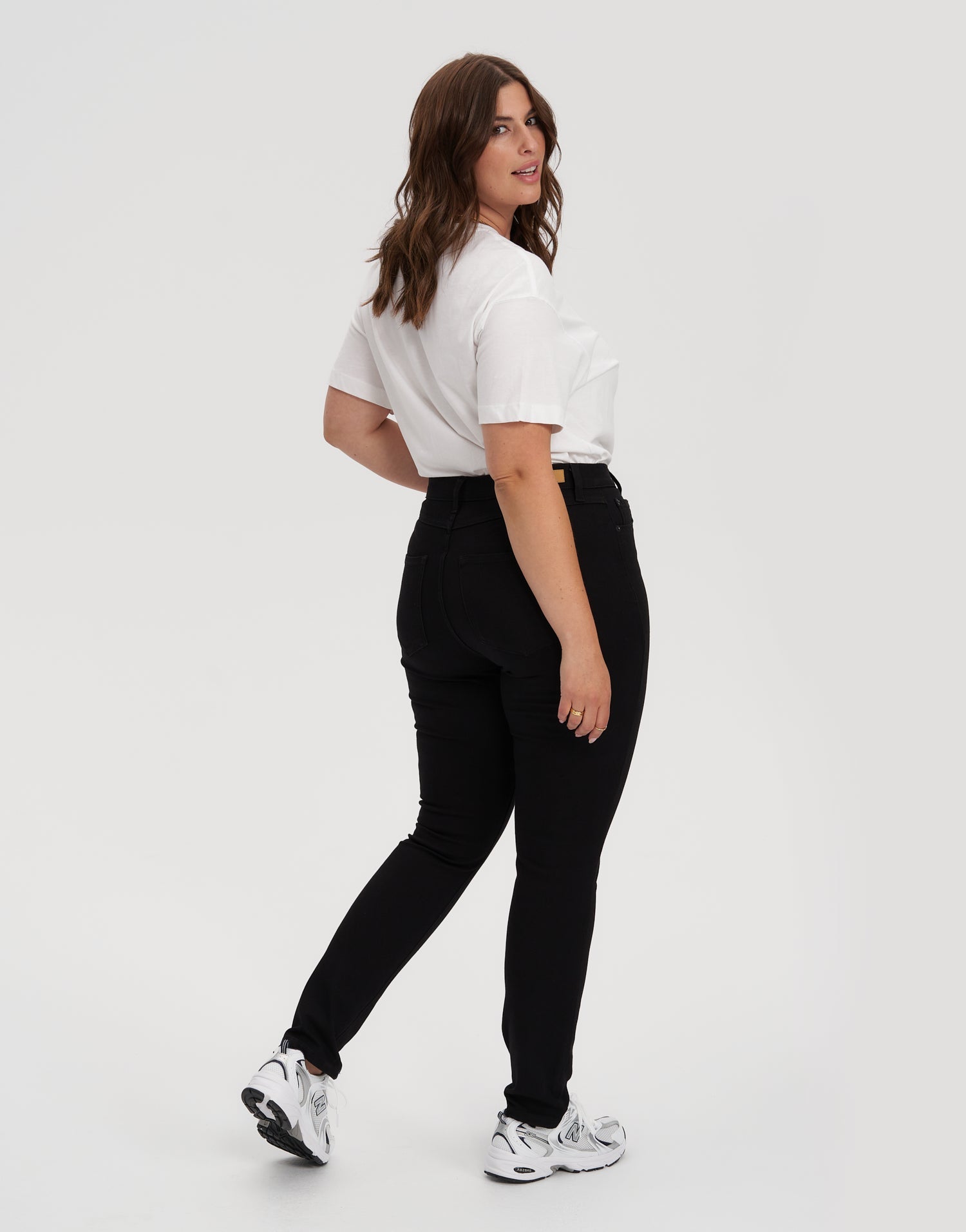 Lina is 5'8" and wearing a size 26. Gabrielle is 5'9" and wearing a size 32.