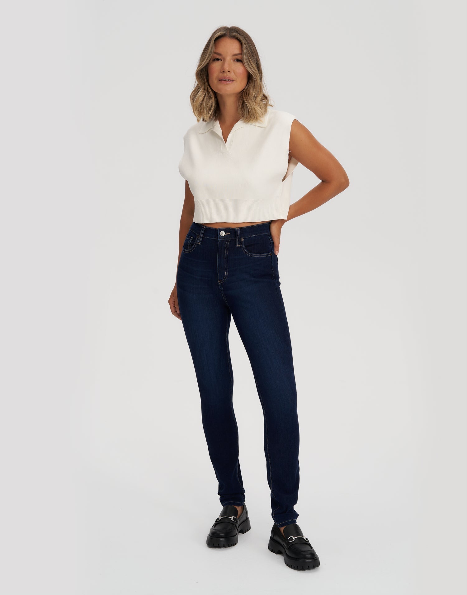 These high-rise skinny jeans are a dark indigo wash with subtle whiskers and a 30" inseam. They are the perfect balance of casual and sophistication, giving versatility for wherever your day may take you.