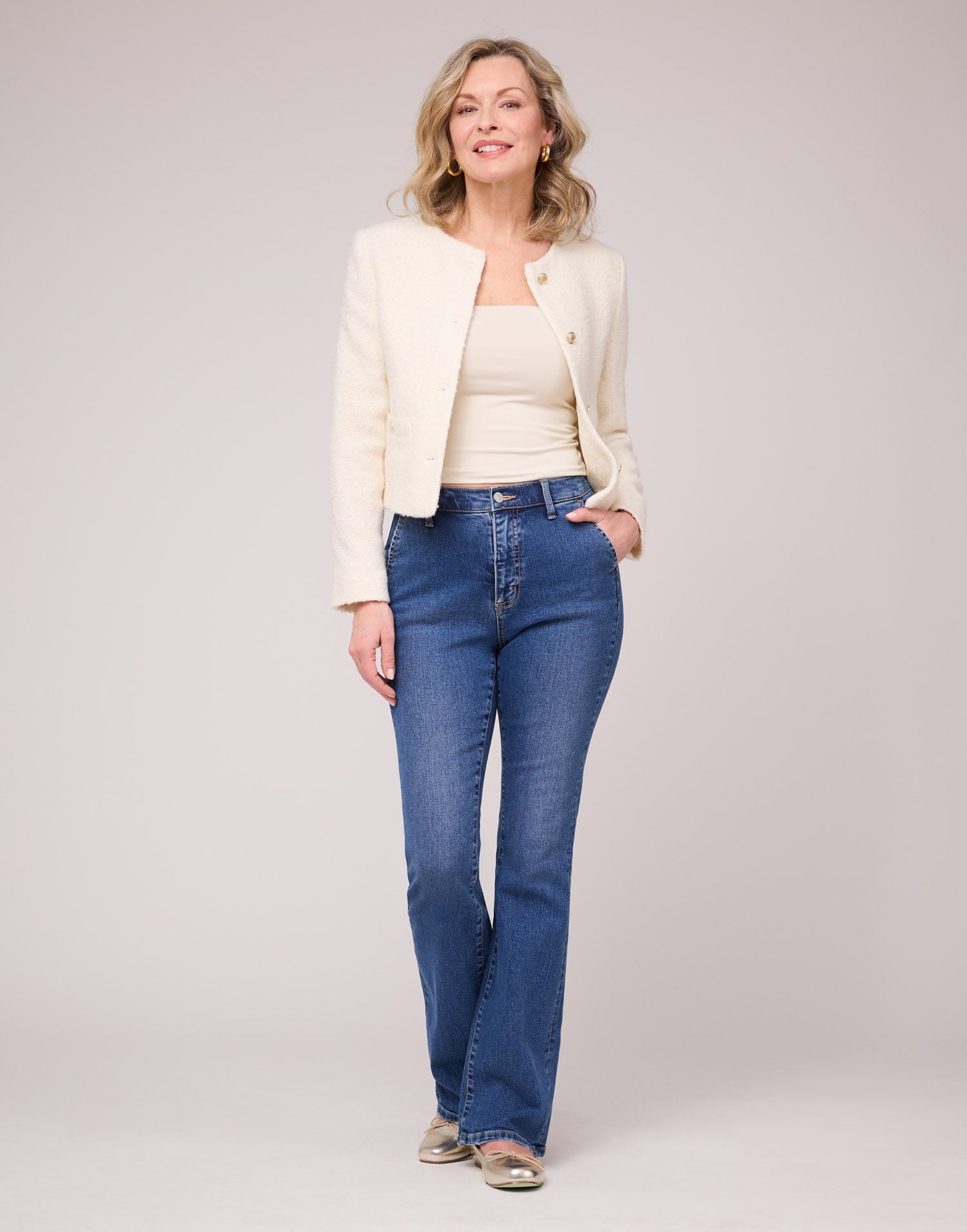 Ce jeans est conçu pour vous donner une allure élégante avec sa jambe évasée. Ce modèle a un entrejambe de 32", une teinte bleue accentuée par des surpiqûres beiges, des poches obliques à l'avant et welt à l'arrière. Il s'agencera parfaitement à plusieurs pièces de votre garde-robe.