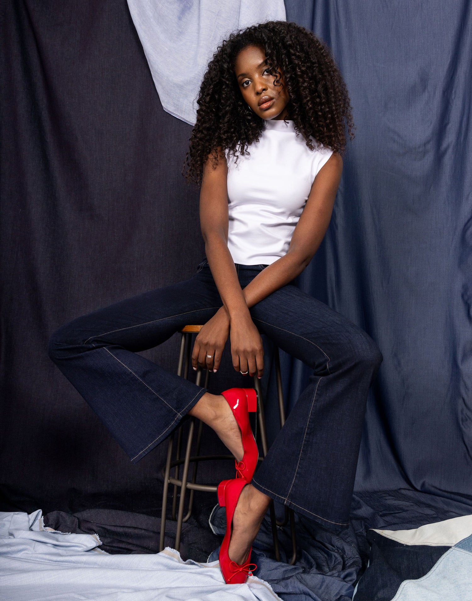Alex, notre jean à coupe évasée, ajustée de la taille aux hanches et est évasée à partir des genoux.