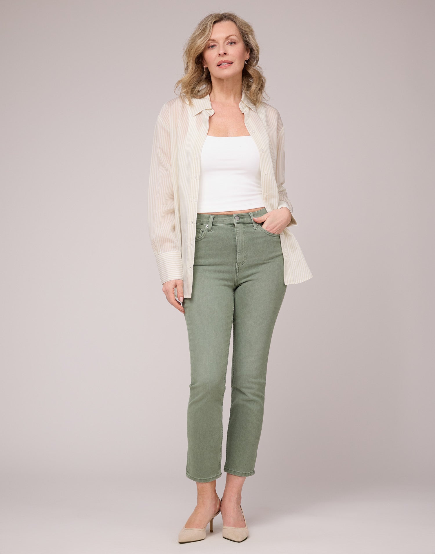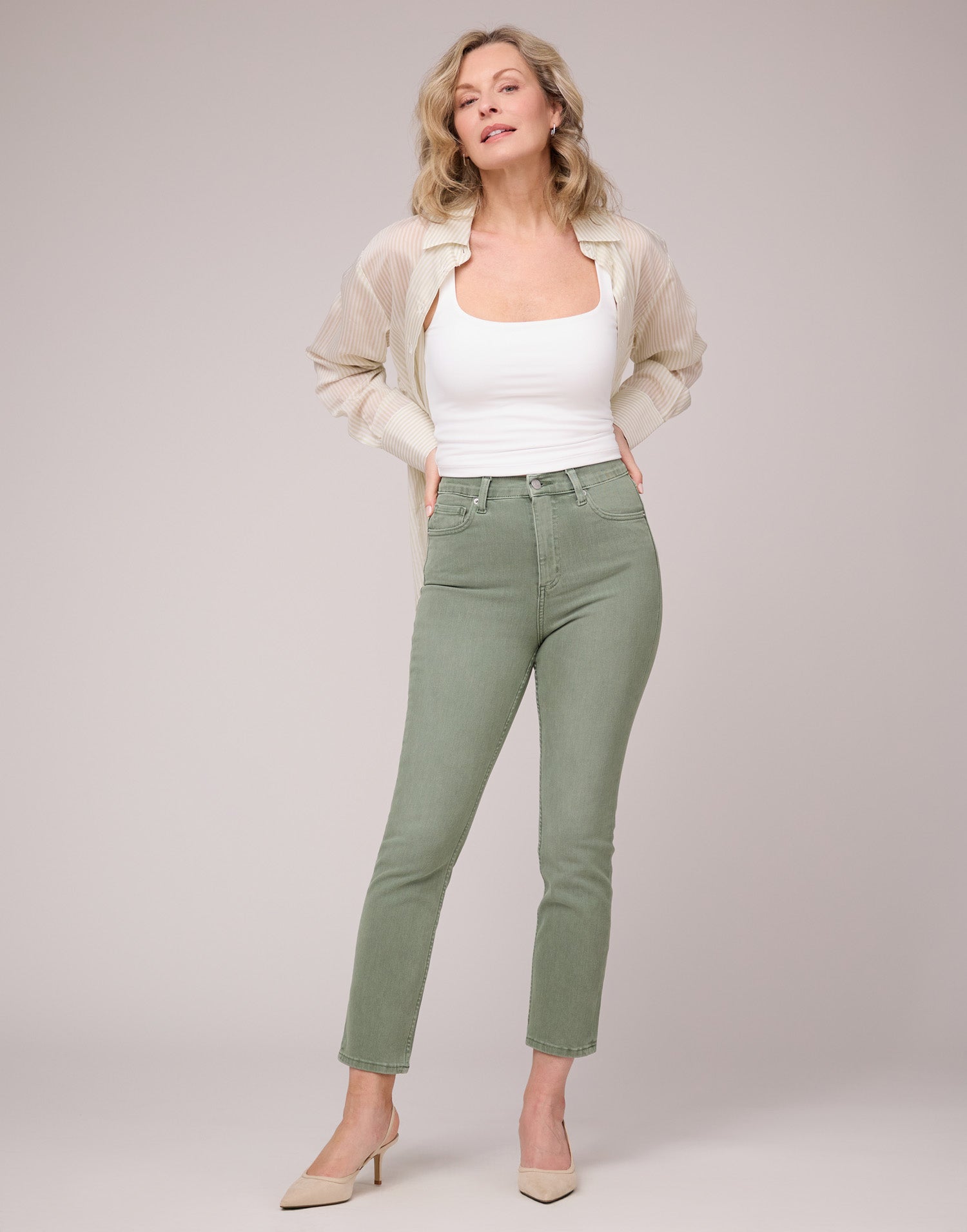 Le jean Beach Grass présente une jambe ajustée, une taille haute et un entrejambe de 27 p...