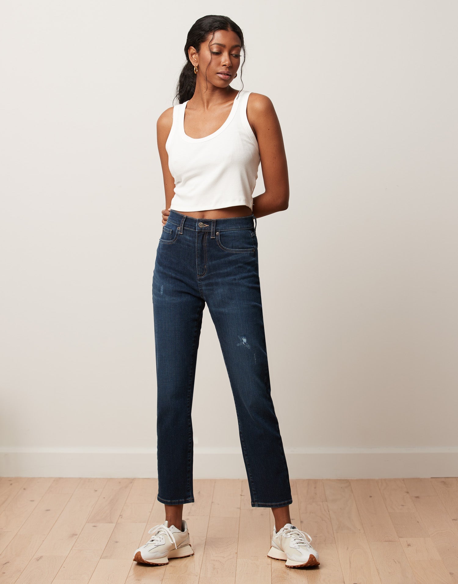 Emily, notre jean coupe ajustée, s'inspire des mom jeans pour un ajustement parfait autour des hanches et une coupe fuselée sur toute la jambe.