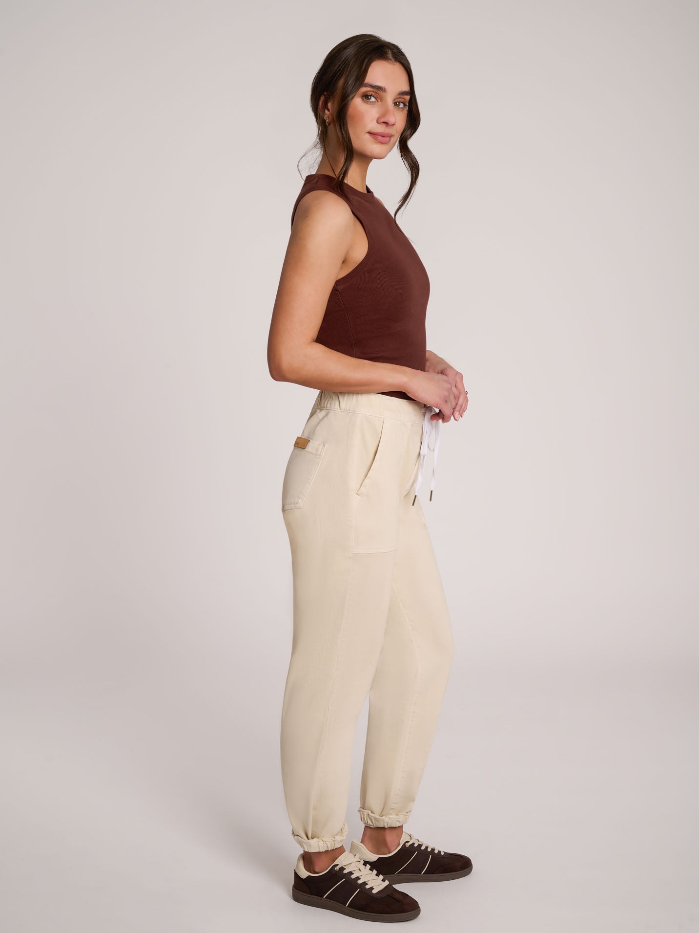 DESCRIPTION Meet your new go-to denim joggers! These high-rise beauties in a soft, light sand shade bring the pe...