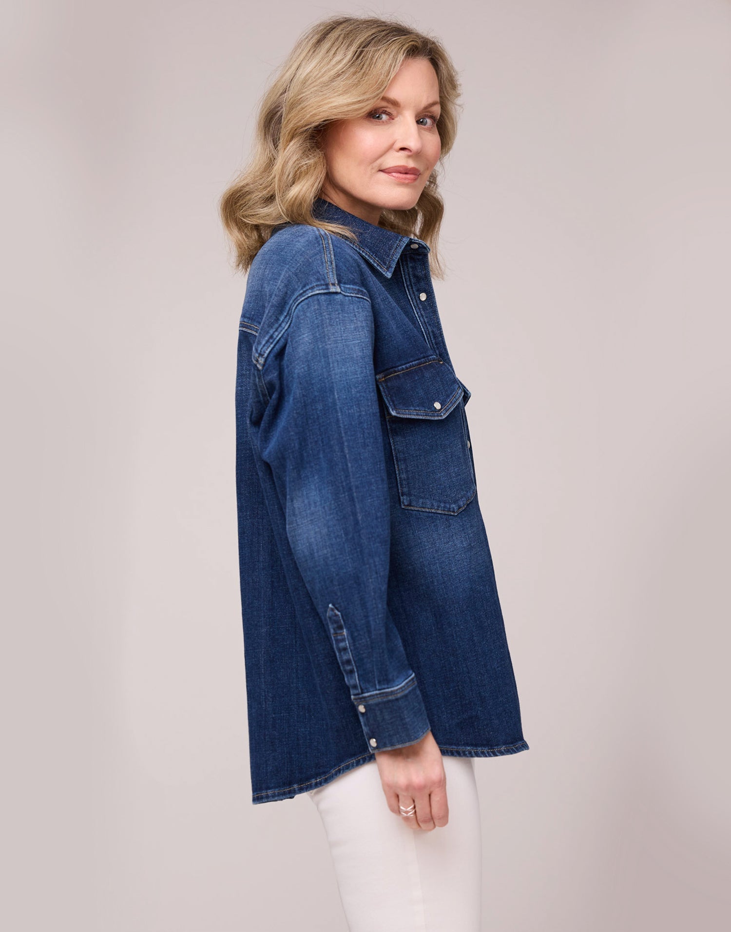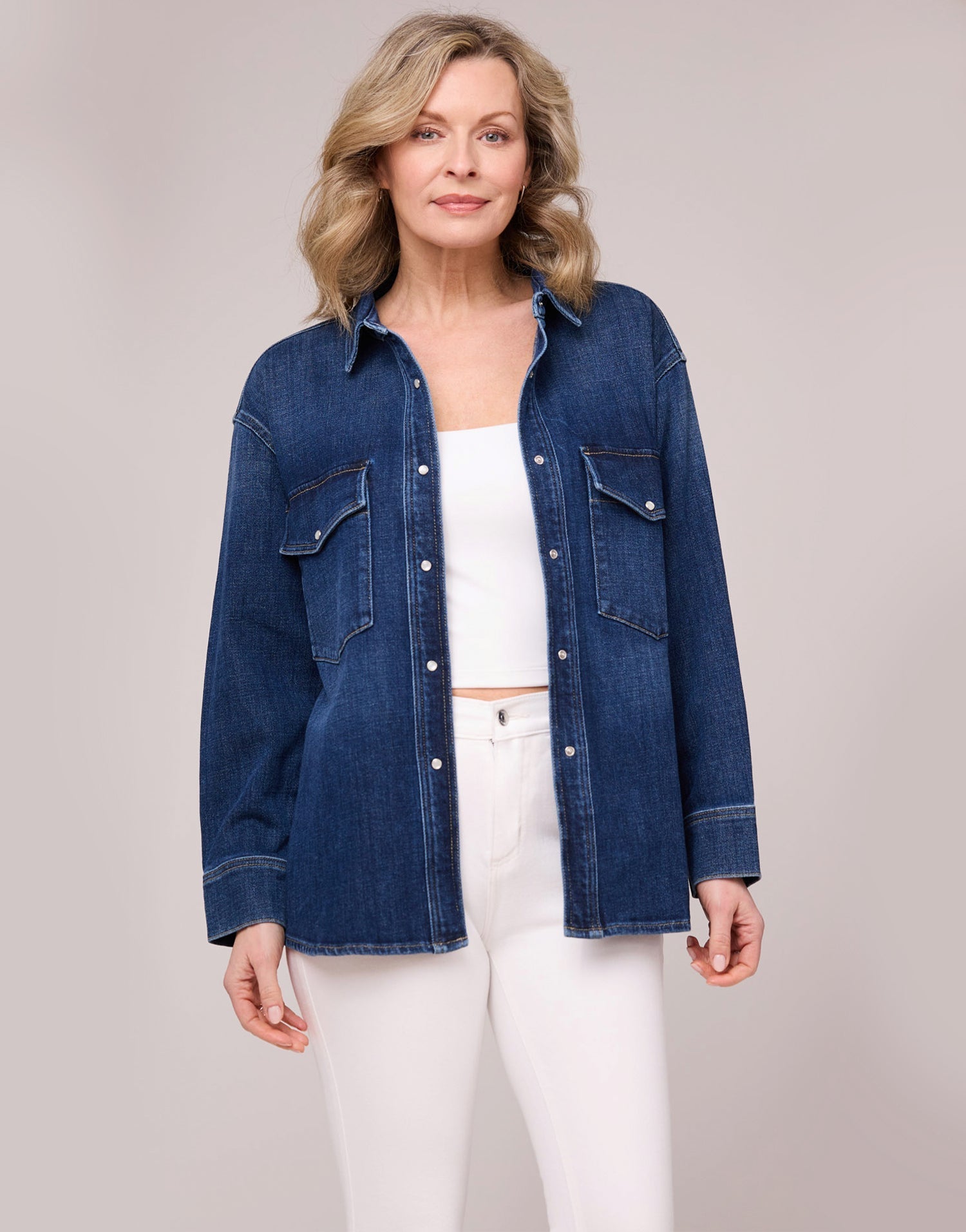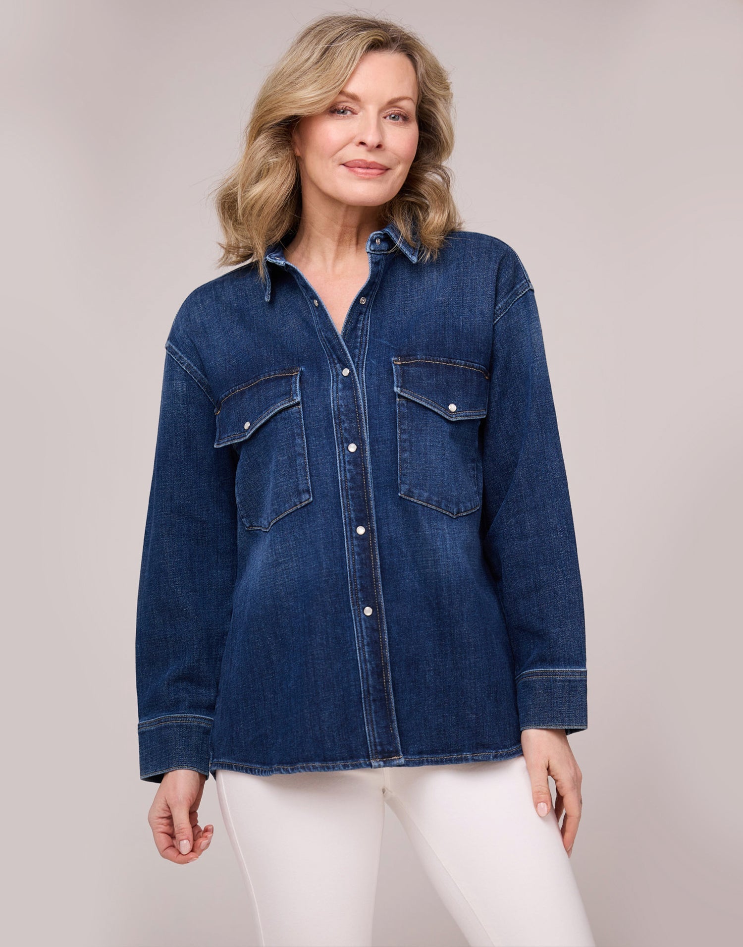 Our oversized vintage-inspired shacket is elevated by iridescent button closures practical two-front closure patch pockets, and wide cuffs ensuring both classic elegance and everyday functionality.