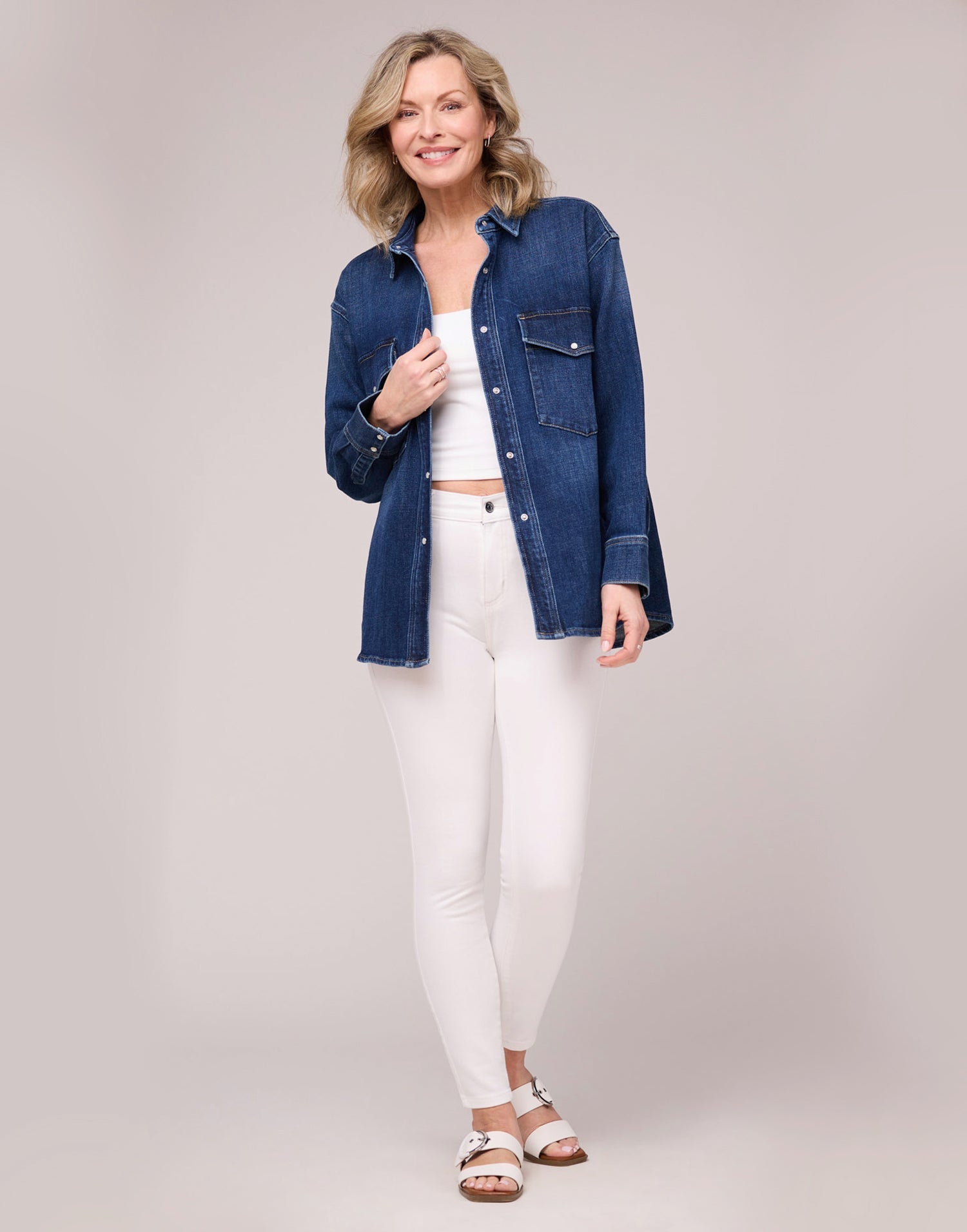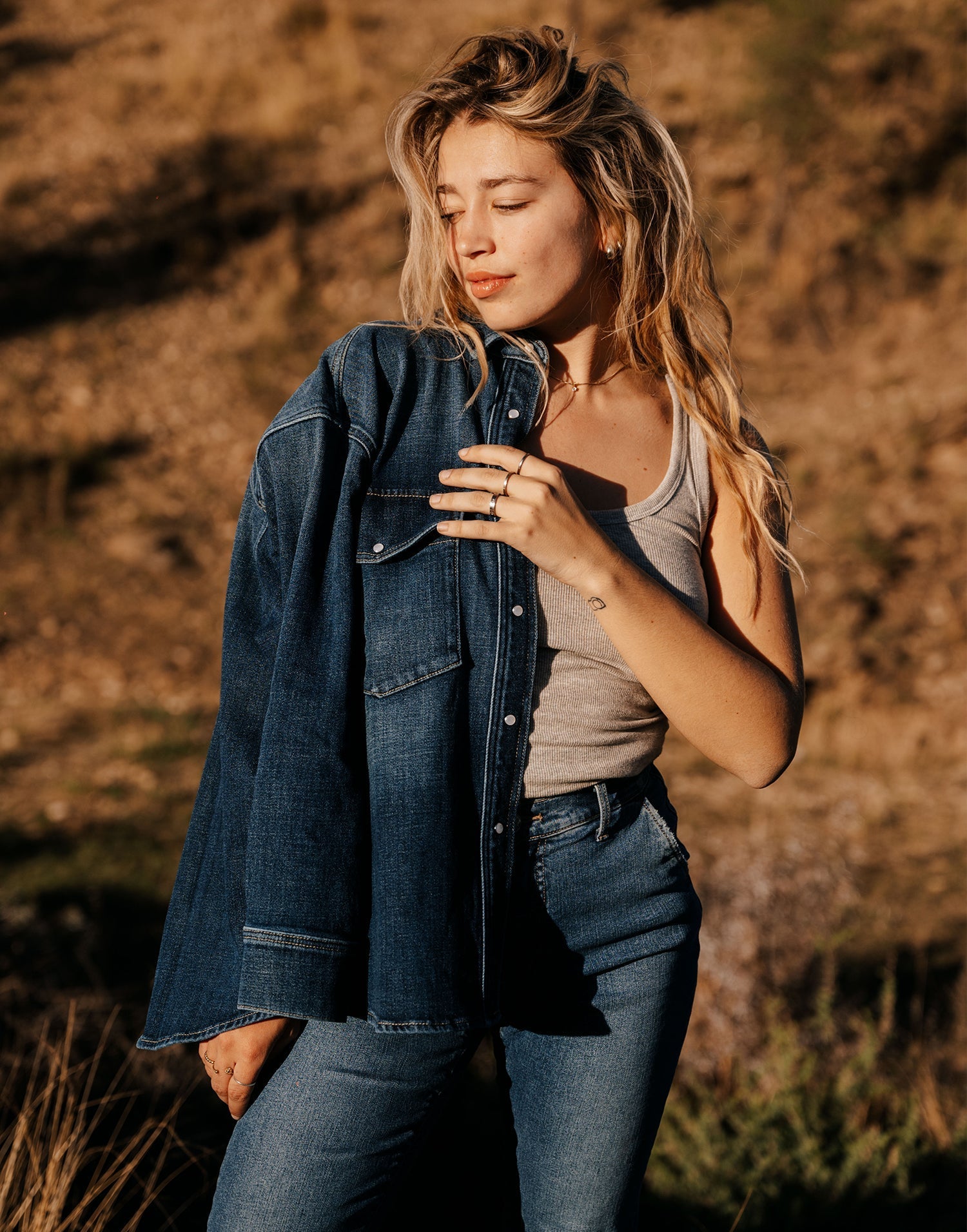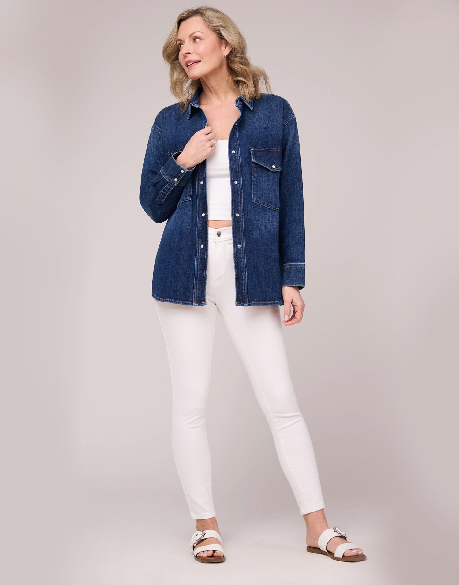 Our oversized vintage-inspired shacket is elevated by iridescent button closures practical two-front closure patch pockets, and wide cuffs ensuring both classic elegance and everyday functionality.