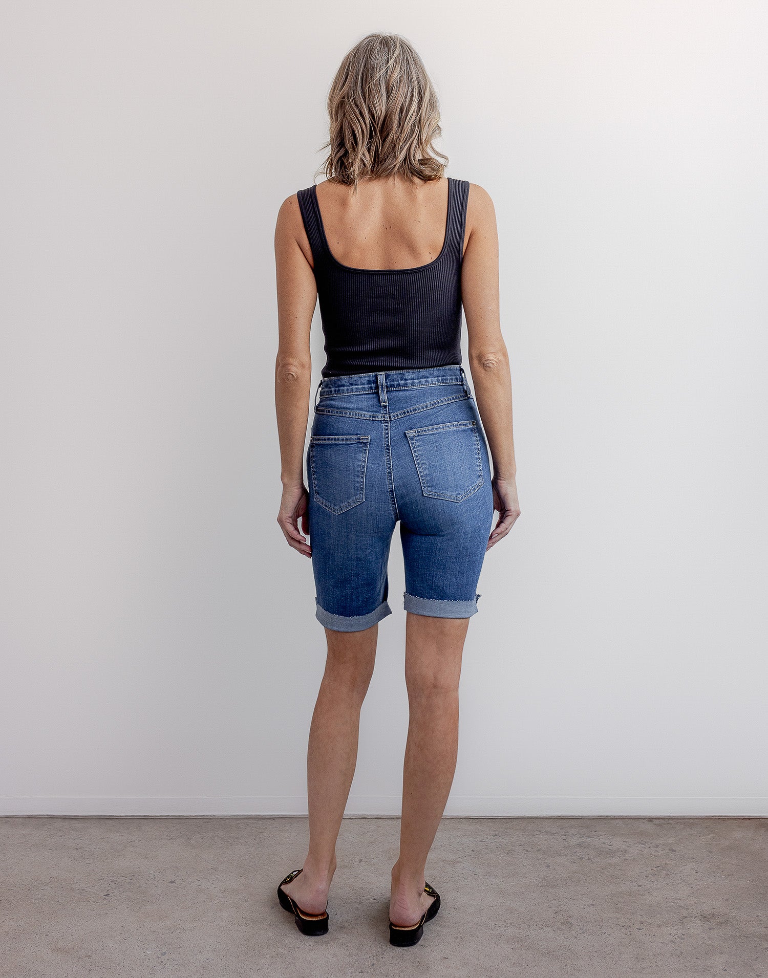 This style crafted in our Vintage denim uses open-ended cotton blends that provide an authentic look without the need to break them in—inspired by pre-loved denim to replicate the worn-in comfort of your favorite pair of jean shorts.