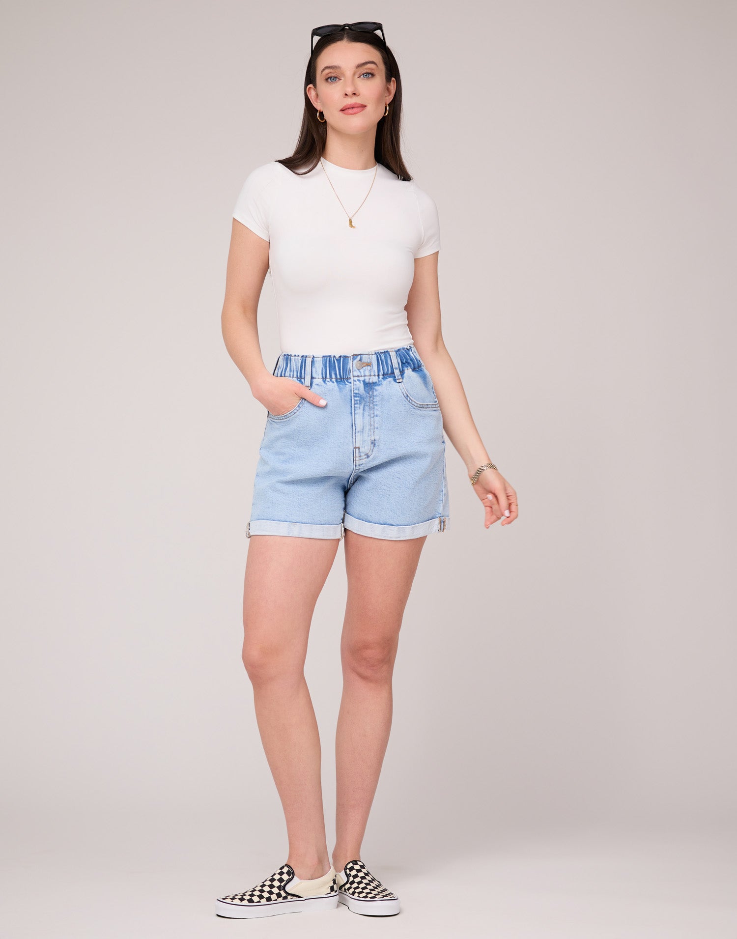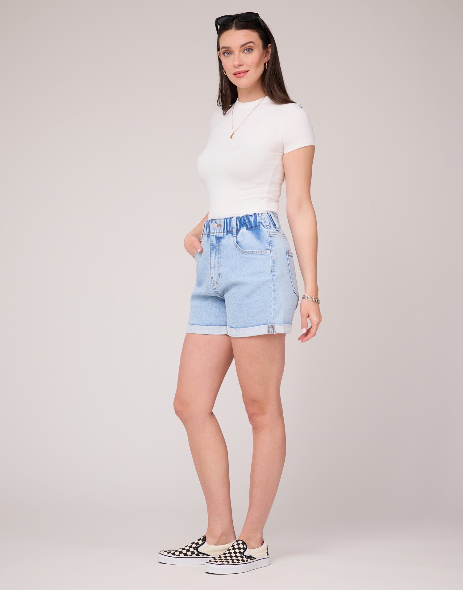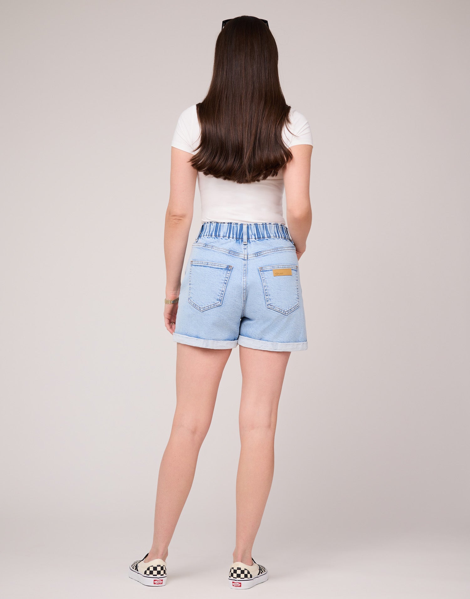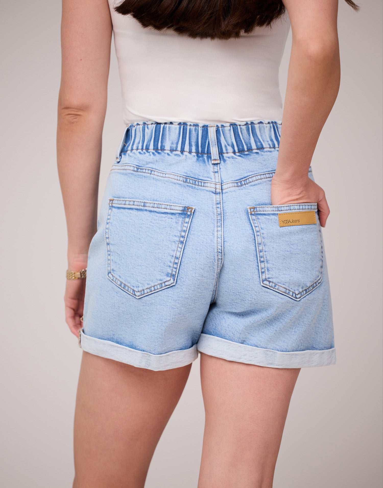 These shorts are crafted from light blue denim with a subtle acid-wash effect. They feature a super high-rise wide elastic waistband, button closure, and zipper for an ultra-comfortable fit.