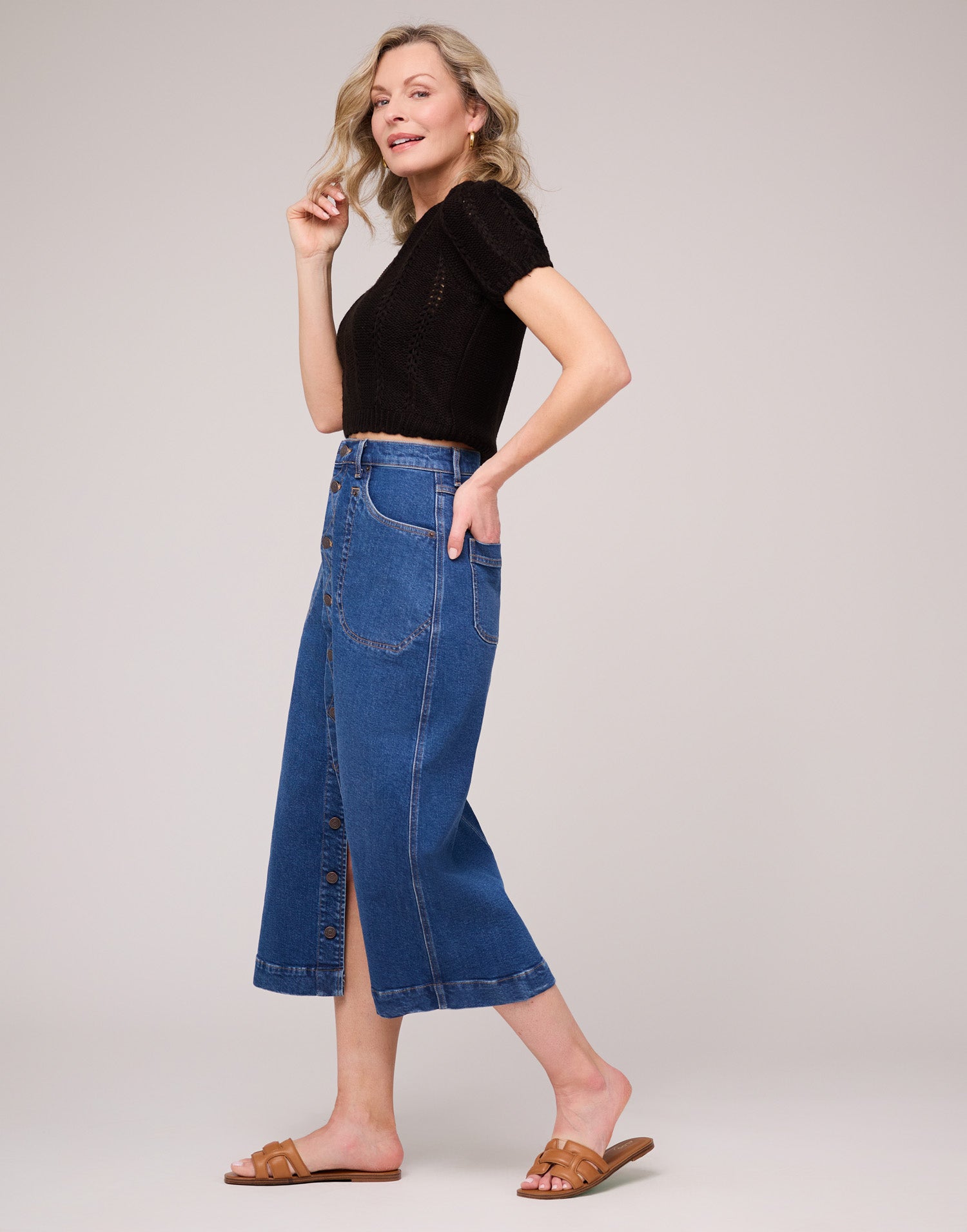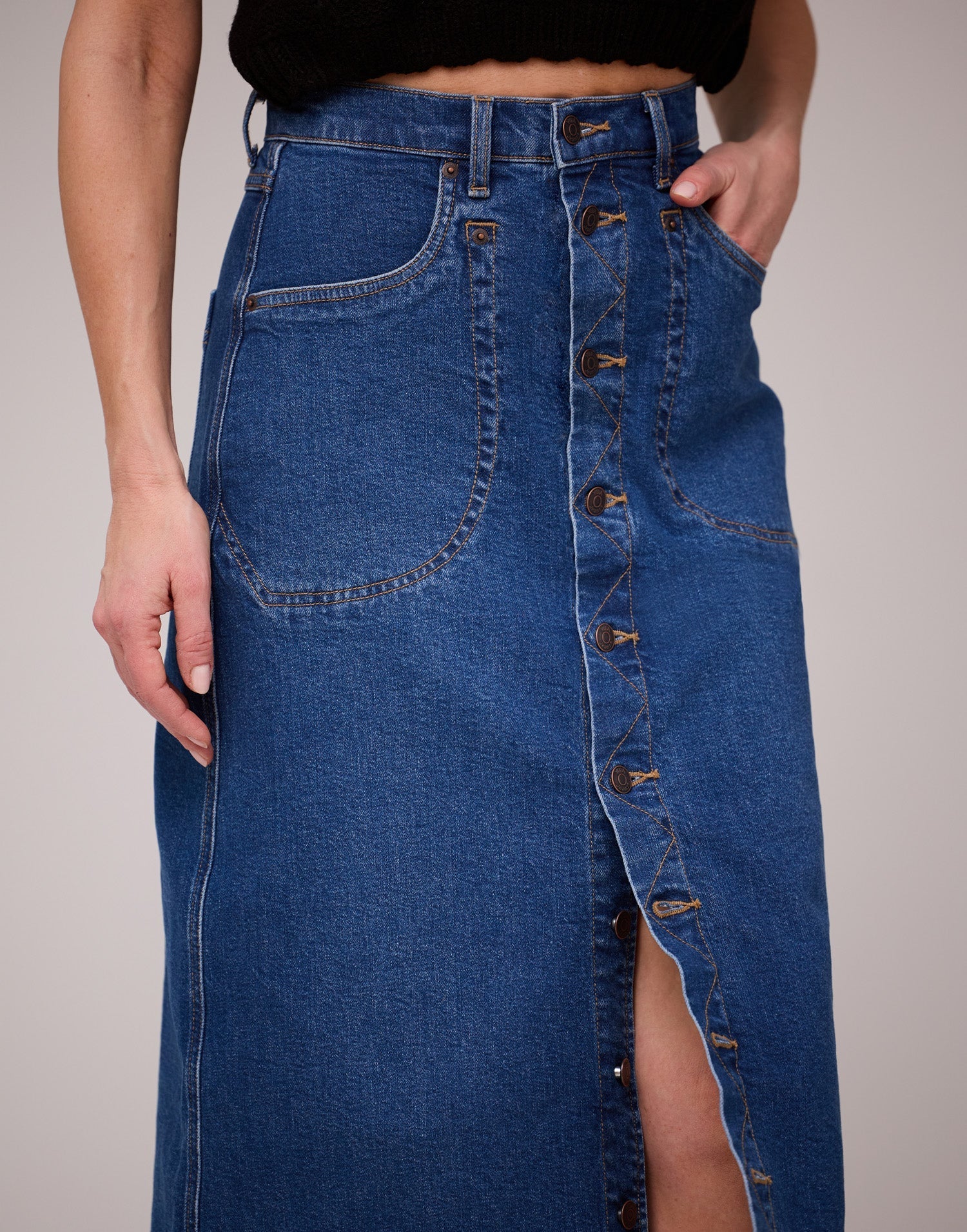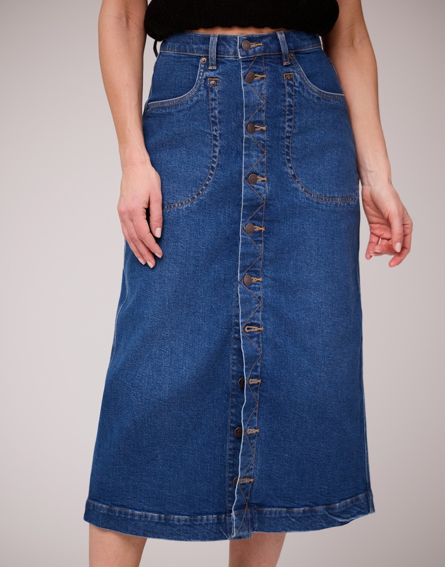 Fashion meets comfort with our Hibiscus A-line skirt. This mid-length denim skirt features a stylish row of front copper buttons, adding a trendy twist to a classic design.