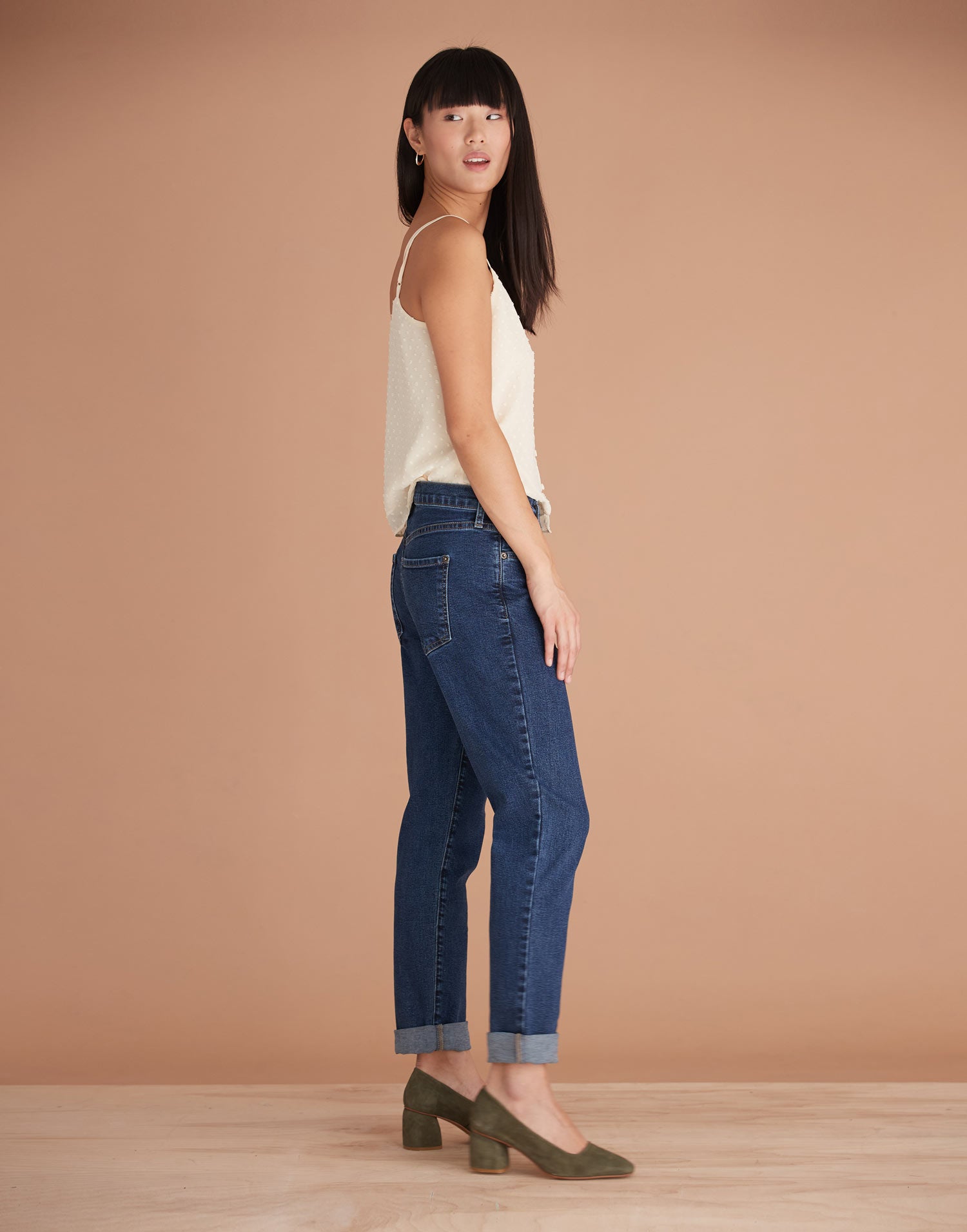 Description du Produit: Ce jean à taille haute a un entrejambe de 28’’ avec les ourlets enroulés. Le bleu moyen en f...